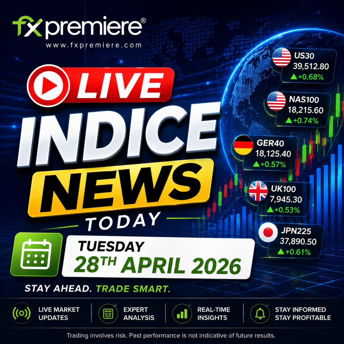 Indices from 28 April 2026 are driven by FOMC, AI earnings, oil prices, U.S.-Iran risk, yields and tech leadership. FXPremiere favors confirmation-based US30, NAS100 and S&P 500 trading.